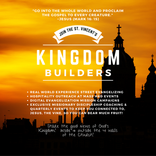 Kingdom Builders is a community dedicated to sharing the love of Christ. It is designed to support us as we answer our commission to evangelize in our daily lives. We focus on street evangelizing as well as sharing the Gospel right here at St. Vincent's—guest and parishioner outreach—before, during, and after Masses and events.